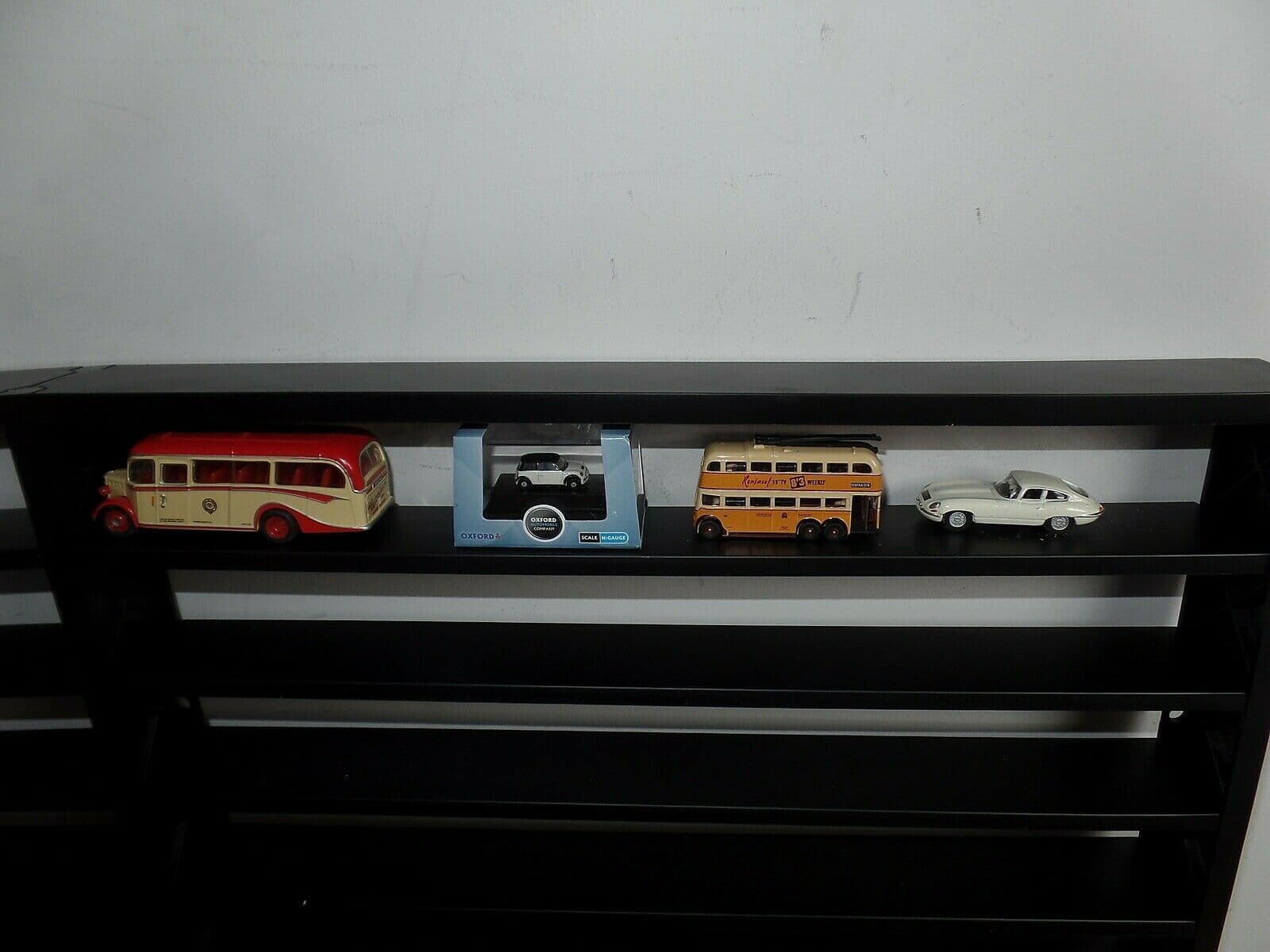 This is a Display Case that has holes to fix to a wall, comes with 3 screwsThis was made for the trains but does take single deck 1/76 buses, 1/76 cars. N gauge cars look a bit small without the box but the buses & Trucks fit wellThe auction for the case only, picture 4 is included to show what could be done with the 1/220 trains!The unit measures 81cm wide, 36.5cm high and 4.5cm deepEach shelf measures 38.5cm wide 4.5cm high and 4.5cm deepComes flat packed but only takes 5 mins to assembleDue to the weight this UK only!Can be collected from Eastbourne at no cost