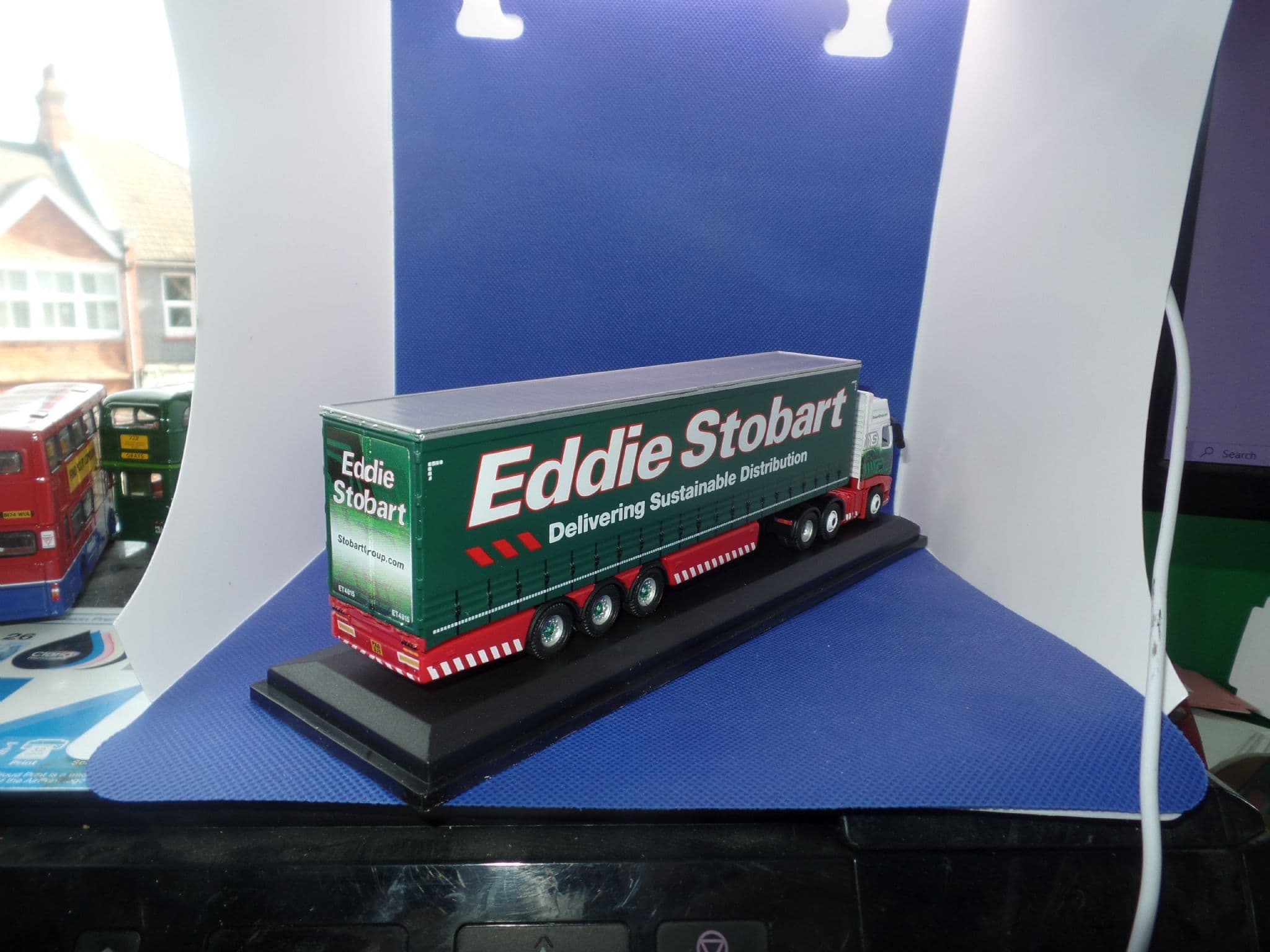New tooling on the equally new real life Volvo FH4 brings another modern addition to our truck series. We have also provided for two versions of the cab � the G and GXL, both promising a wealth of livery opportunities - and we have chosen the G version to launch our first release, hauling a curtainside trailer in the familiar Eddie Stobart colour scheme. Registered KR13 VYD, the tractor unit is decorated in a distinctive black, grey and white with red skirt, white aerofoil, black sun visor and with the multi shaded and cleverly applied modern green Stobart graphics along the side. Note the added detail of a right hand water tank in black and the fuel tank in silver. The curtainside trailer advertising the company's Delivering Sustainable Distribution slogan is in dark green with silver roof, red chassis and printed with white and red lettering. The back doors are also highly decorated in degrees of green and white, also featuring the Eddie Stobart name and website details.